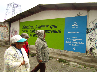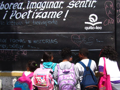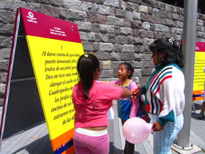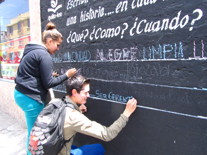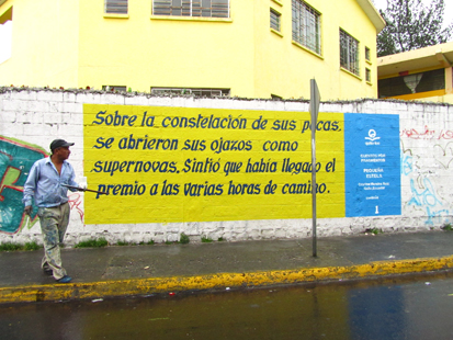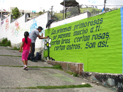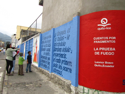 Mural interventions were installed adjacent to the Quito public libraries to promote intergenerational literacy activities. Scavenger hunts were used to invited participants to search for clues in their community to complete a story that was written with fragments of information from their neighborhood. David Hinojosa was the typography artist who created a remarkable visual installation through using free hand calligraphy art for each of these murals.